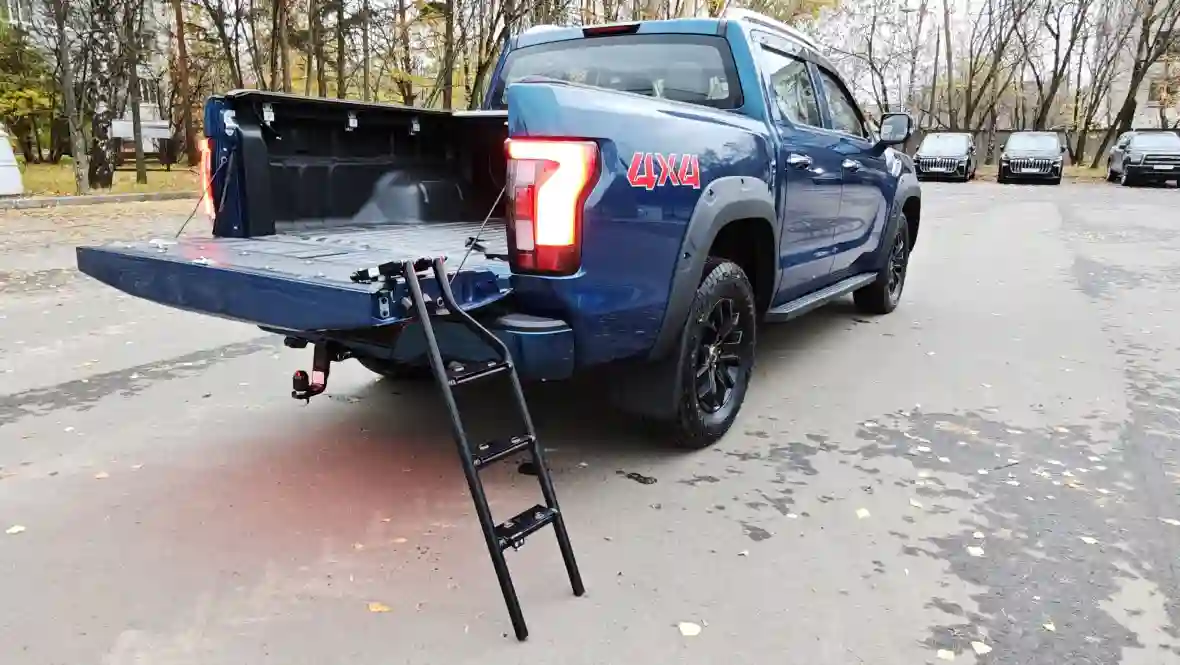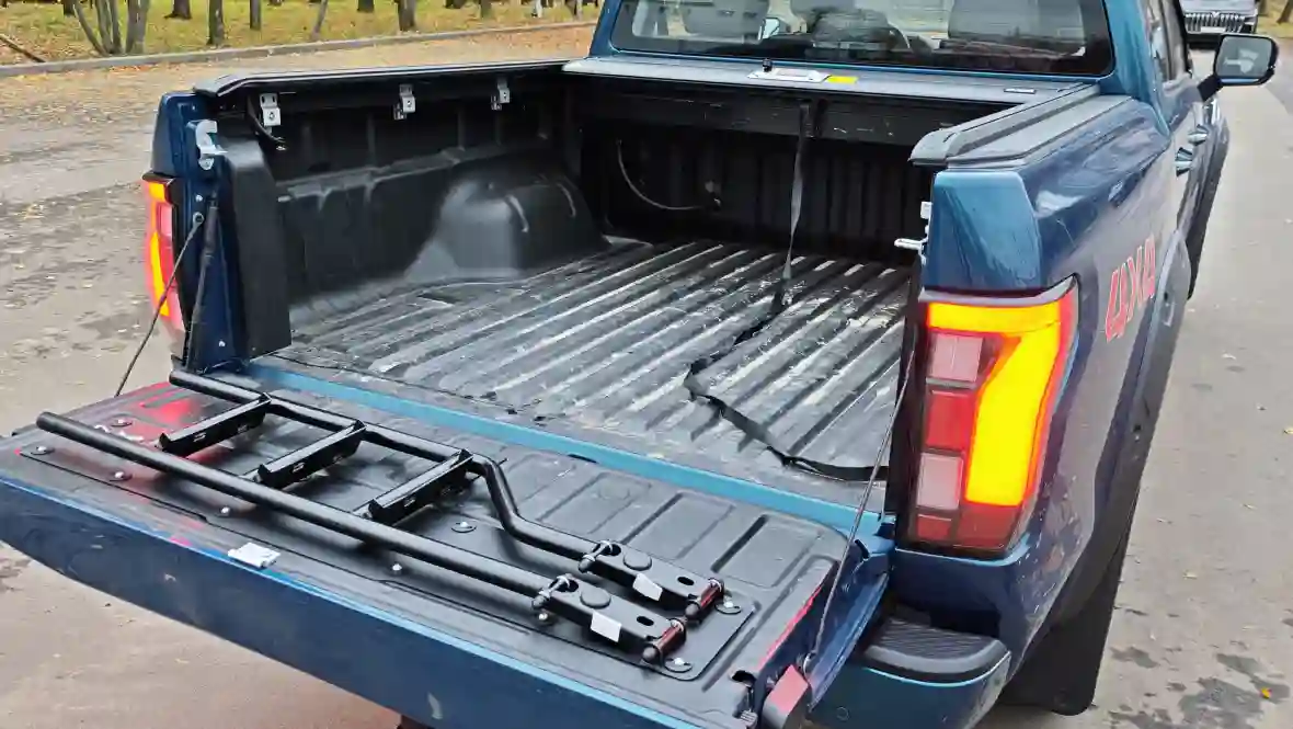 Сзади TUNLAND V7 не отстаёт: массивный бампер, крышка кузова с интегрированным LED-фонарём и демпингом, а также дополнительные крепления для сетки или тента делают корму утилитарной, но элегантной — без лишнего хрома, зато с акцентом на функциональность.