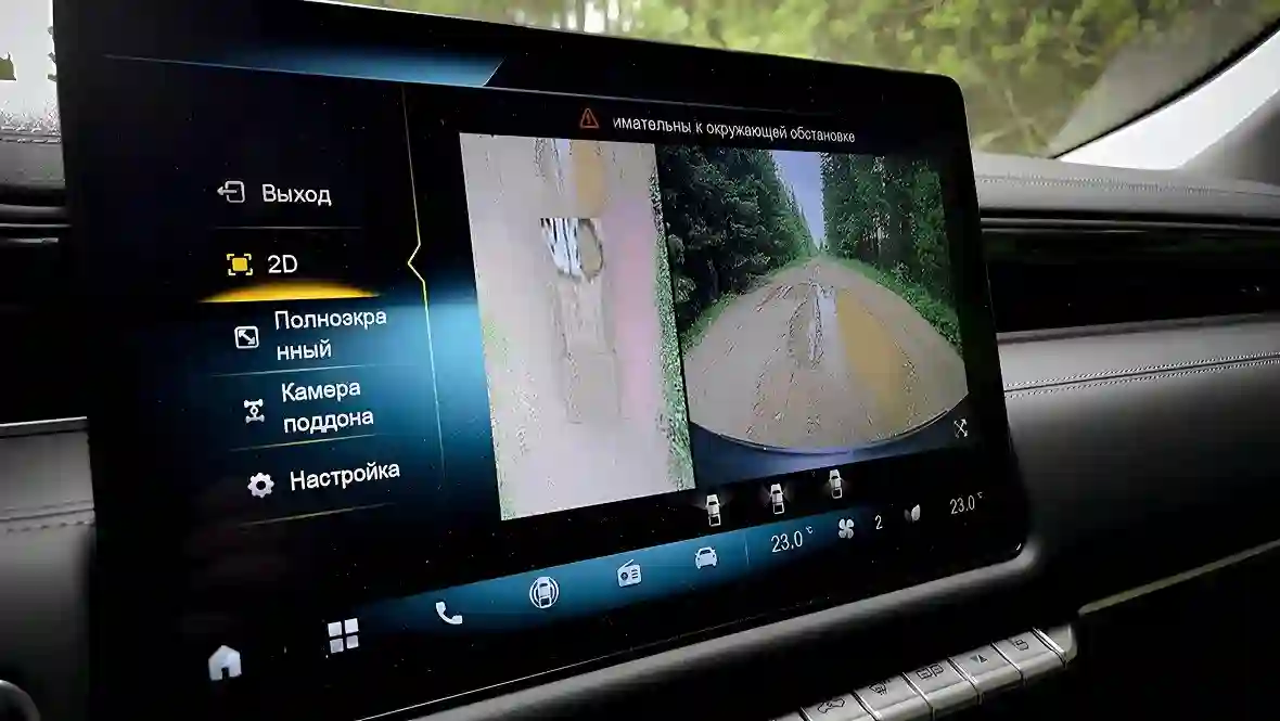 Они активируются автоматически при включении задней передачи или по кнопке на руле/экране, формируя на 14,6-дюймовом планшете виртуальную «птичью» проекцию машины сверху — идеально для парковки в тесных дворах или манёвров с прицепом. Важной особенностью системы стал режим «прозрачное шасси»: камеры накладывают изображение дороги под машиной, с наложением контуров рамы и колёс, что особенно полезно на бездорожье — видишь ямы, камни или лужи заранее, без слепых зон. Качество картинки приличное днём (HD-разрешение), но ночью или в дождь чуть зернистое.