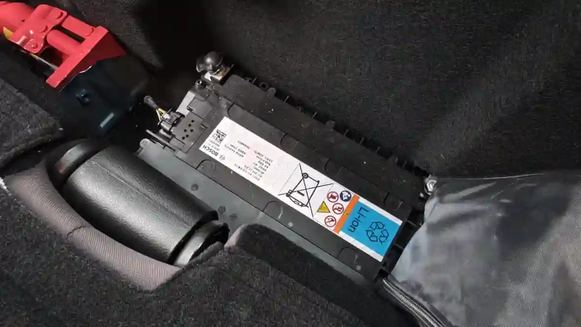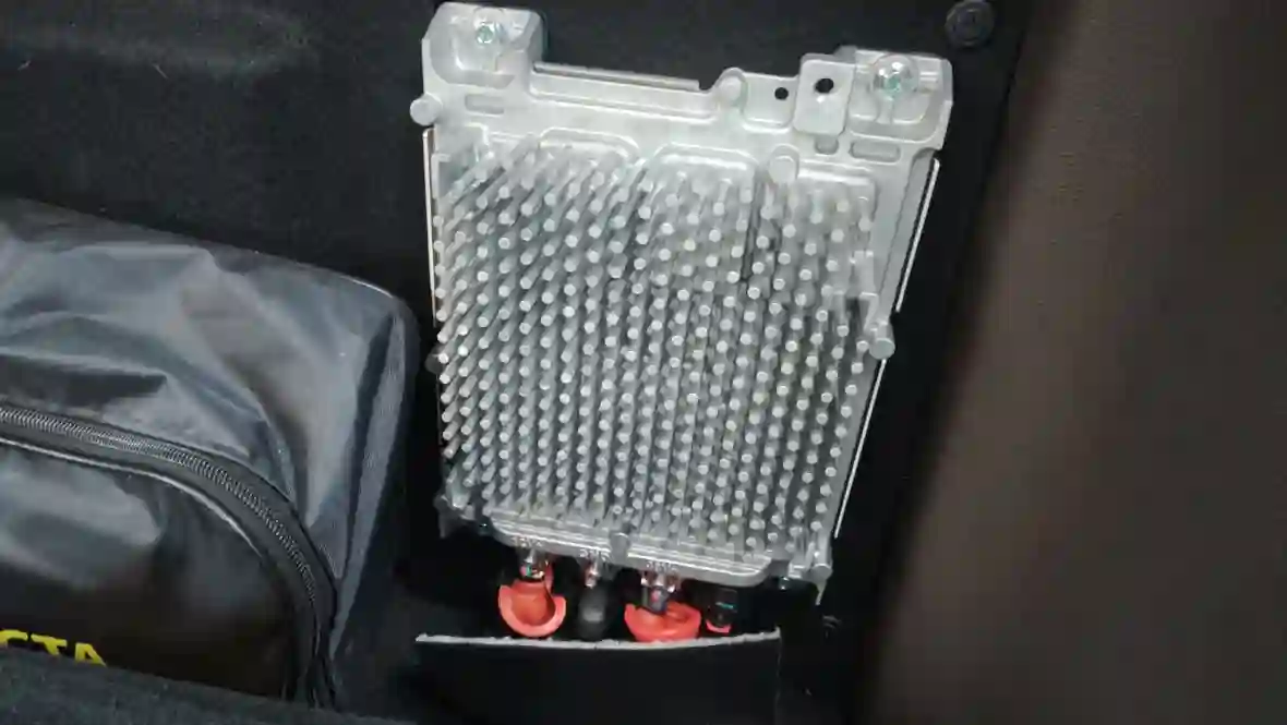 При этом 48-вольтовая батарея (литий-ионная, ёмкостью 8,4 Ач) находится не под сиденьем, как в некоторых легковушках, а за задним сиденьем в салоне — в нише под спинкой. Это плоский «кирпич» размером с небольшую сумку, интегрированный в обшивку, чтобы не мешать пассажирам.