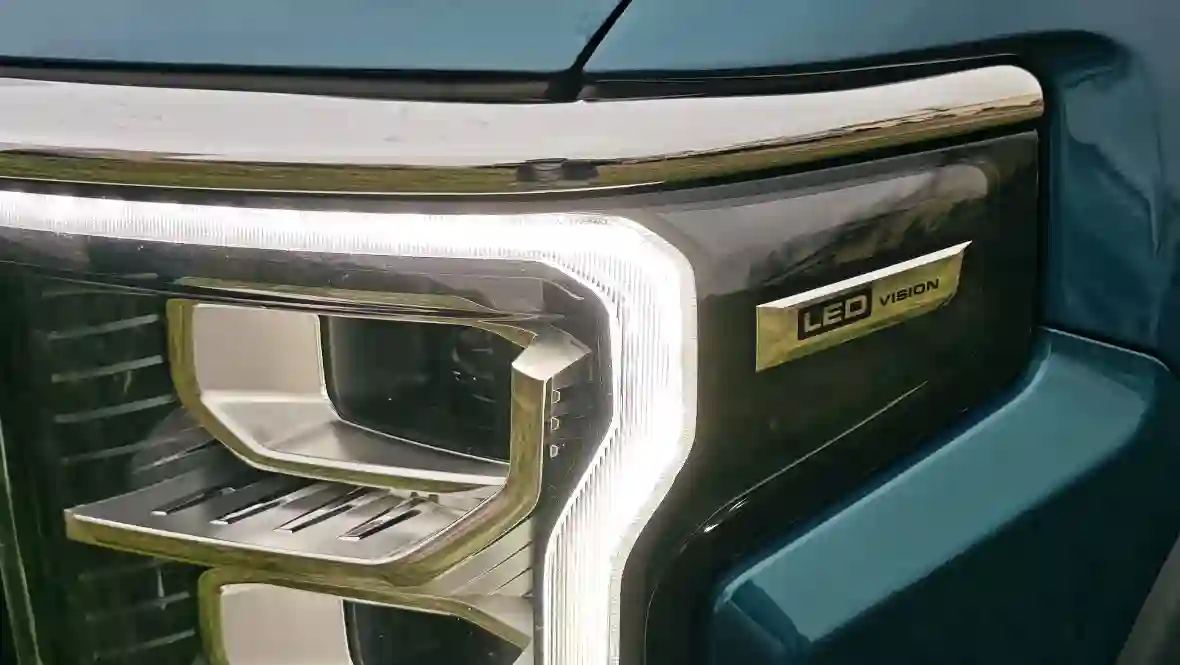 Она обрамлена выразительными чёрными акцентами, а по бокам её фланкируют раздельные LED-фары с четырьмя блоками — острые, как клинки, они обеспечивают не только отличный обзор, но и «хищный» взгляд, это делает пикап более заметным в потоке.
