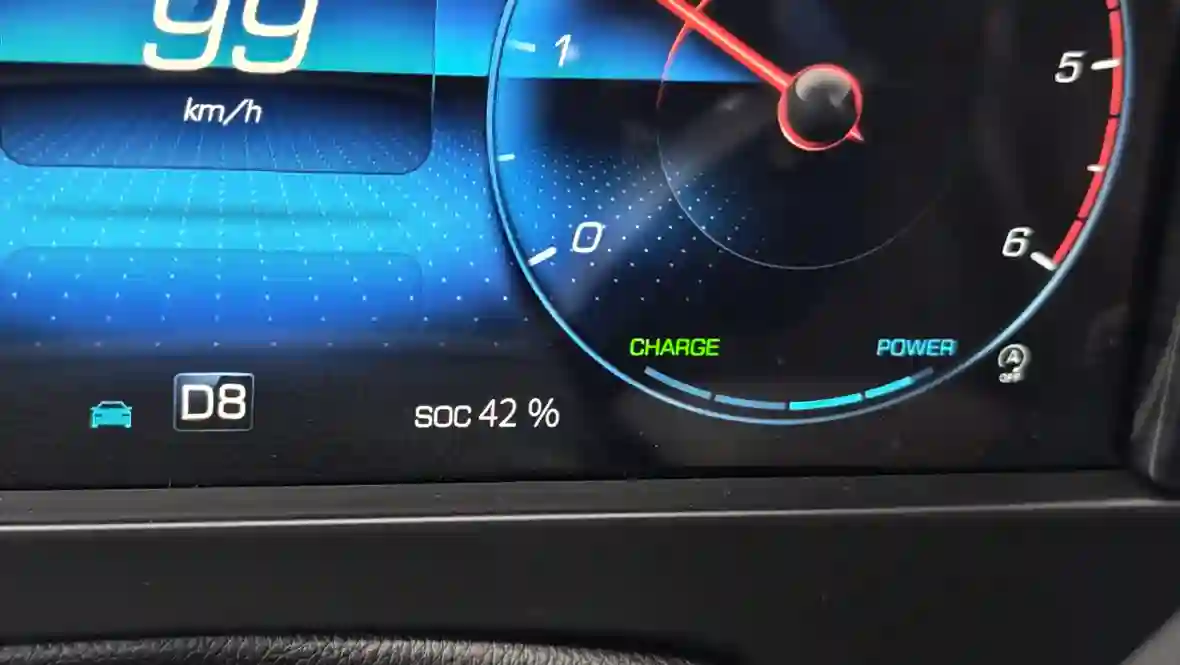 При полностью заряженной батарее индикатор показывает 90–100% SOC. При активной езде по трассе без частых торможений показатель постепенно падает до 50–70 %, что компенсируется торможениями или движениями накатом (иногда за пару минут с 60 % до 90 %). А, вот при низком заряде (< 30–40 %) система переходит в «чистый» дизельный режим — буст и помощь стартер-генератора временно отключаются, чтобы не посадить батарею в ноль.