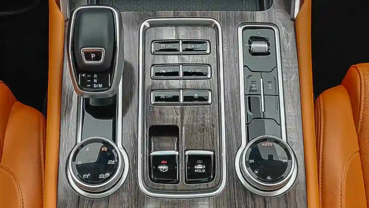 Порадовало дублирование основных функций управления системами автомобиля физическими кнопками, аккуратно размещёнными в ряд под «телевизором» и на центральной консоли. Выбор режимов движения и управление полным приводом можно осуществлять с помощью двух больших шайб на той же консоли. Это весьма удобно, особенно в тяжёлых дорожных условиях.